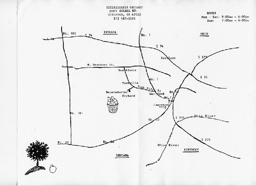 BEIERSDORFER ORCHARD - Indiana's Finest 21874 Kuebel Rd. - Guilford, Indiana 47022 - Phone/Fax 812-487-2695 Hours: Monday through Saturday, 9am-6pm Sunday, 1pm-6pm • Home • Seasonal Info for Apples • Hilda's Helpful Recipes • Our Wonderful Cider • Children's Projects • Other Products • Ready Now and Coming Soon • Directions to the Orchard • Beiersdorfer Orchard Photos •